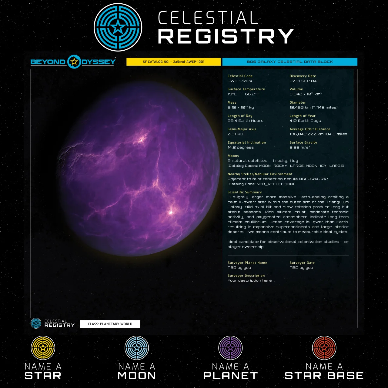The Celestial Registry is the permanent archive of worlds named inside the Beyond Odyssey universe.